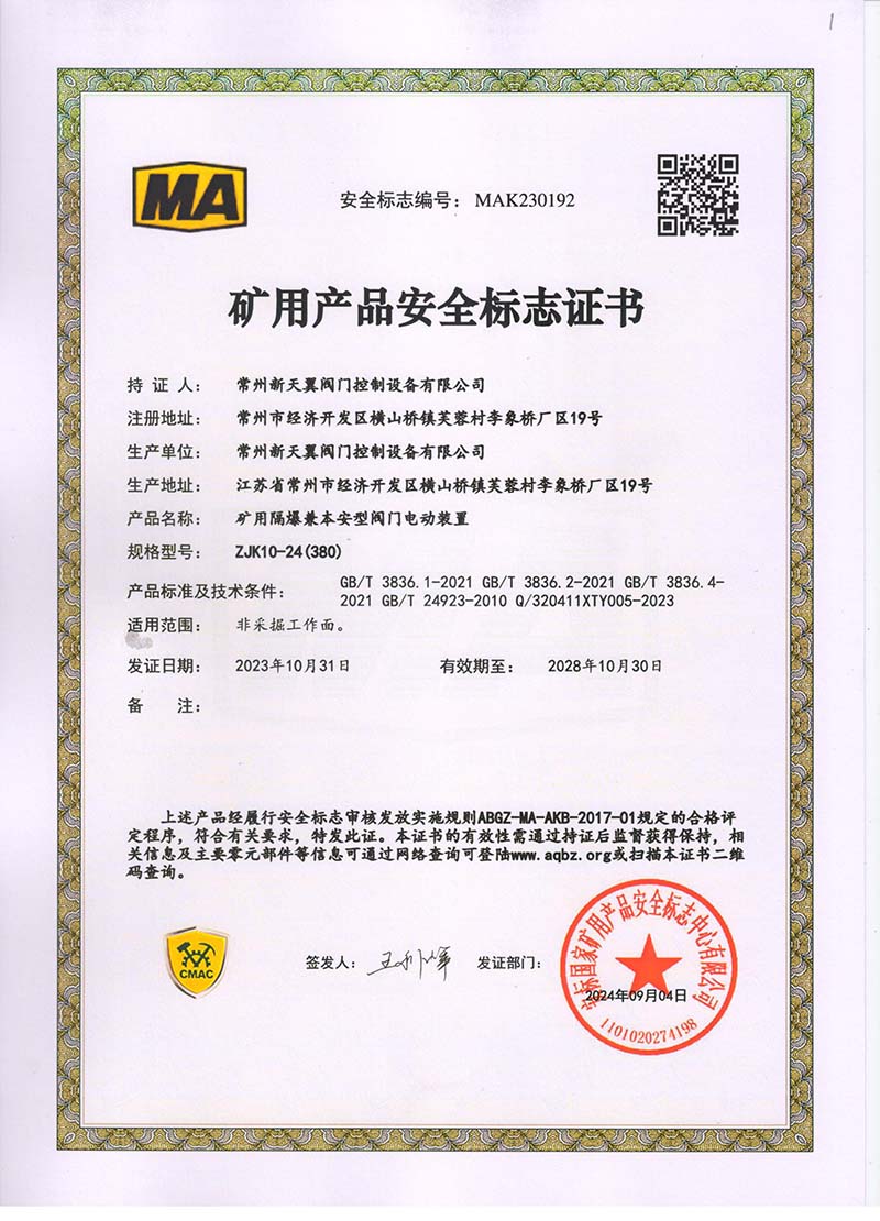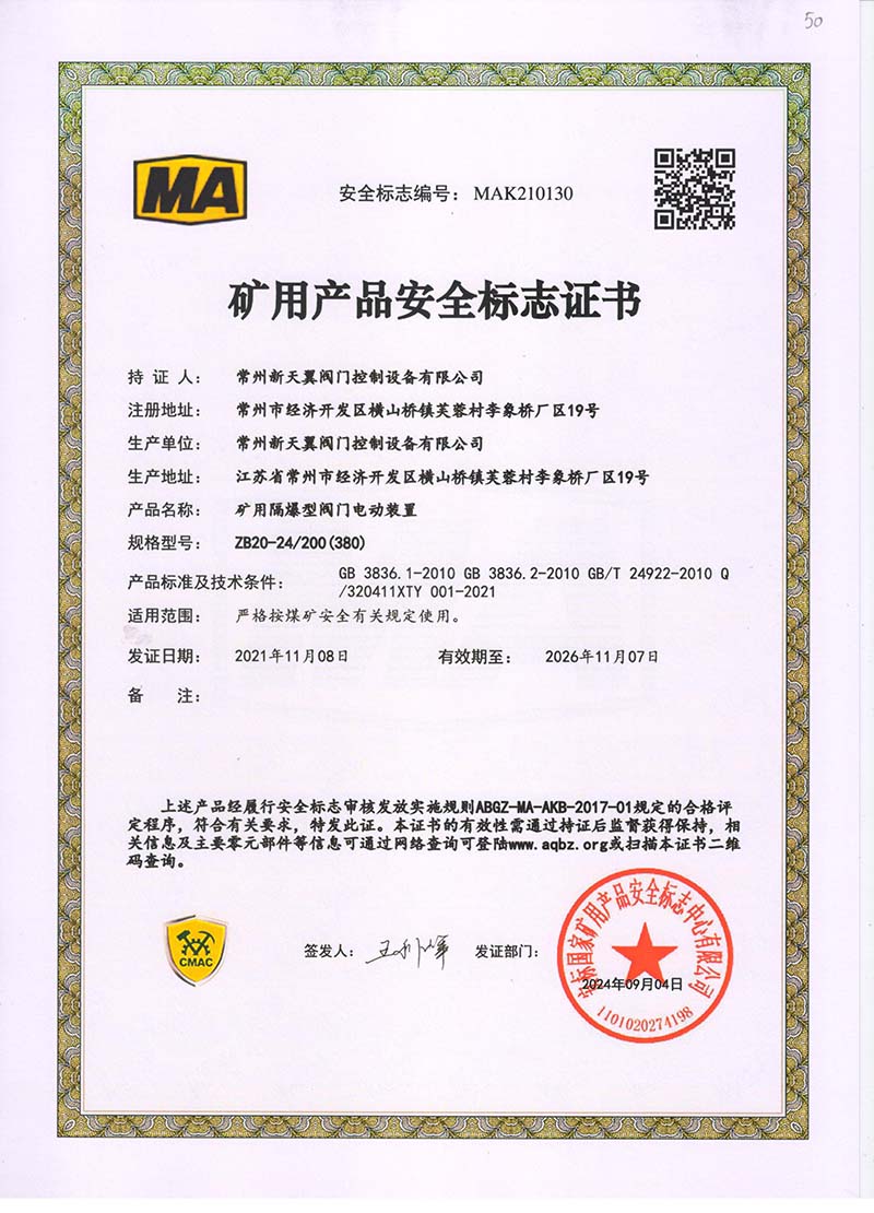 礦用隔爆ZB10-24中國國家強制性產品認證證書110.1